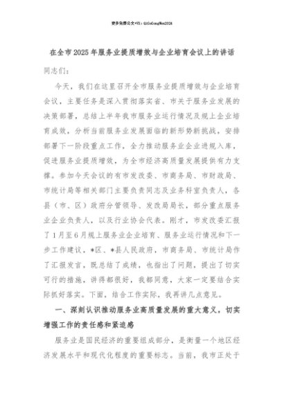 【七哥公文】2025年:【七哥公文】在全市2025年服务业提质增效与企业培育会议上的讲话+更多免费公文+VX:QiGeGongWen2024+更多免费公文+VX:QiGeGongWen2024