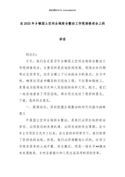 【七哥公文】2025年:【七哥公文】在2025年乡镇国土空间全域综合整治工作现场推进会上的讲话+更多免费公文+VX:QiGeGongWen2024+更多免费公文+VX:QiGeGongWen2024