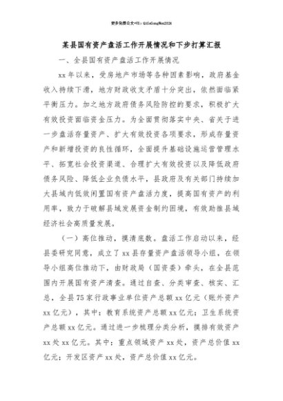 【七哥公文】2025年:【七哥公文】某县国有资产盘活工作开展情况和下步打算汇报+更多免费公文+VX:QiGeGongWen2024+更多免费公文+VX:QiGeGongWen2024