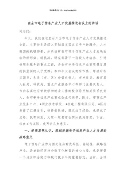 【七哥公文】2025年:【七哥公文】在全市电子信息产业人才发展推进会议上的讲话+更多免费公文+VX:QiGeGongWen2024+更多免费公文+VX:QiGeGongWen2024