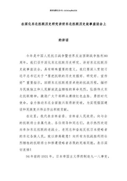 【七哥公文】2025年:【七哥公文】在深化东北抗联历史研究讲好东北抗联历史故事座谈会上的讲话+更多免费公文+VX:QiGeGongWen2024+更多免费公文+VX:QiGeGongWen2024