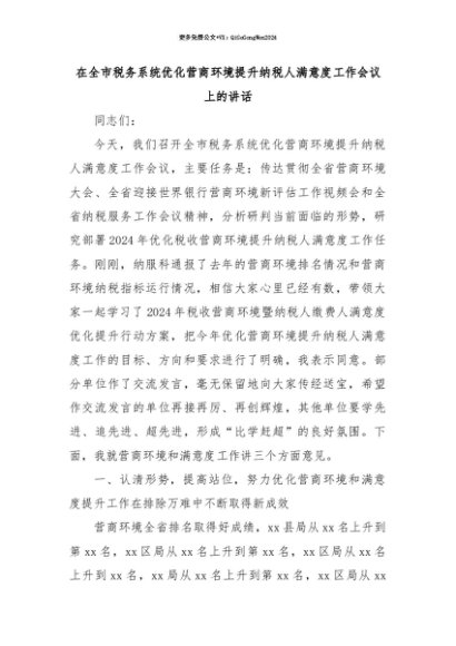 【七哥公文】2025年:【七哥公文】在全市税务系统优化营商环境提升纳税人满意度工作会议上的讲话+更多免费公文+VX:QiGeGongWen2024+更多免费公文+VX:QiGeGongWen2024