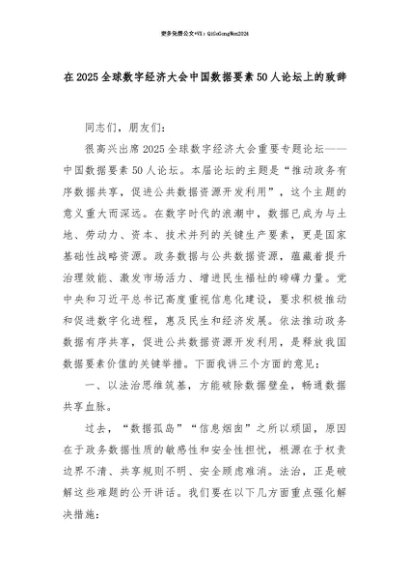【七哥公文】2025年:【七哥公文】在2025全球数字经济大会中国数据要素50人论坛上的致辞+更多免费公文+VX:QiGeGongWen2024+更多免费公文+VX:QiGeGongWen2024