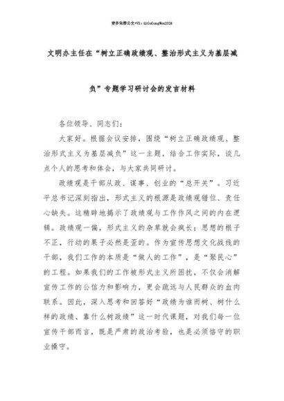 【七哥公文】2025年:【七哥公文】文明办主任在“树立正确政绩观、整治形式主义为基层减负”专题学习研讨会的发言材料+更多免费公文+VX:QiGeGongWen2024+更多免费公文+VX:QiGeGongWen2024