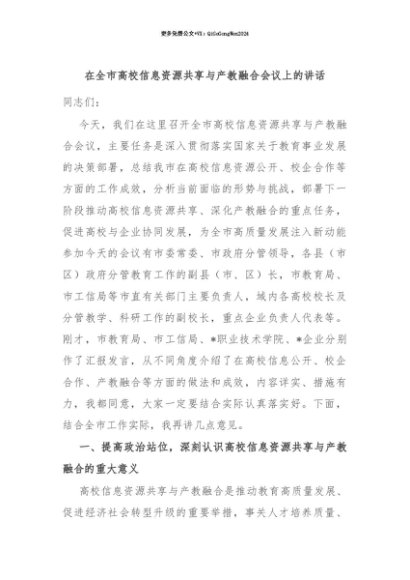 【七哥公文】2025年:【七哥公文】在全市高校信息资源共享与产教融合会议上的讲话+更多免费公文+VX:QiGeGongWen2024+更多免费公文+VX:QiGeGongWen2024