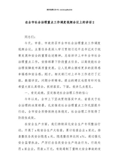 【七哥公文】2025年:【七哥公文】在全市社会治理重点工作调度视频会议上的讲话2+更多免费公文+VX:QiGeGongWen2024+更多免费公文+VX:QiGeGongWen2024