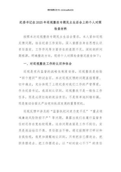 【七哥公文】2025年:【七哥公文】纪委书记在2025年巡视整改专题民主生活会上的个人对照检查材料+更多免费公文+VX:QiGeGongWen2024+更多免费公文+VX:QiGeGongWen2024