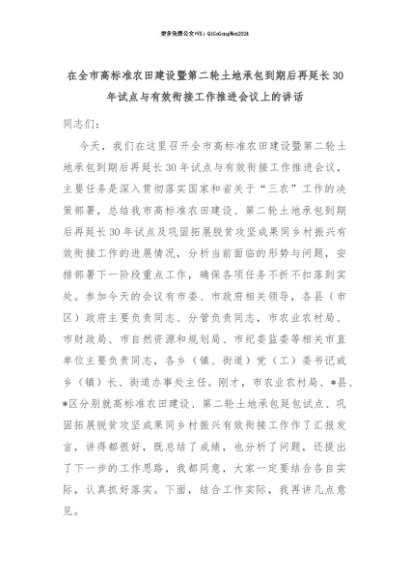 【七哥公文】2025年:【七哥公文】在全市高标准农田建设暨第二轮土地承包到期后再延长30年试点与有效衔接工作推进会议上的讲话+更多免费公文+VX:QiGeGongWen2024+更多免费公文+VX:QiGeGongWen2024