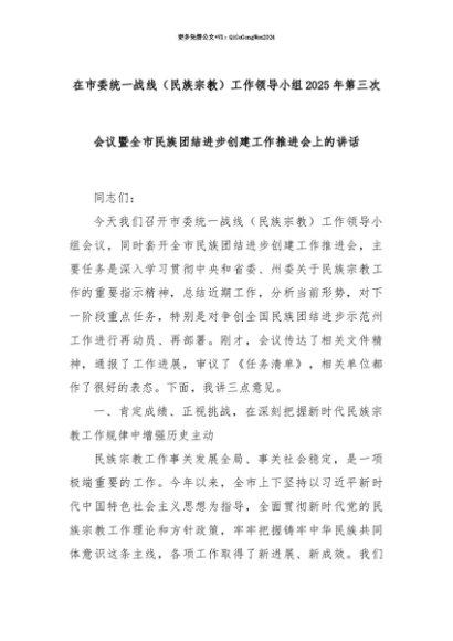 【七哥公文】2025年:【七哥公文】在市委统一战线(民族宗教)工作领导小组2025年第三次会议暨全市民族团结进步创建工作推进会上的讲话+更多免费公文+VX:QiGeGongWen2024+更多免费公文+VX:QiGeGongWen2024