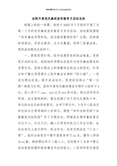 【七哥公文】2025年:【七哥公文】法院开展党风廉政宣传教育月活动总结+更多免费公文+VX:QiGeGongWen2024+更多免费公文+VX:QiGeGongWen2024