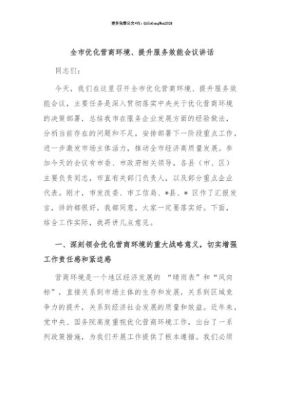 【七哥公文】2025年:【七哥公文】全市优化营商环境、提升服务效能会议讲话+更多免费公文+VX:QiGeGongWen2024+更多免费公文+VX:QiGeGongWen2024