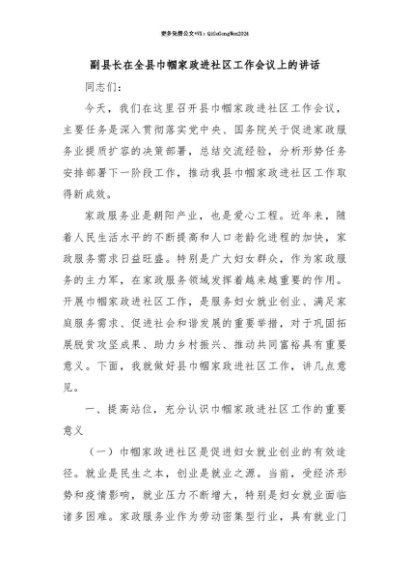 【七哥公文】2025年:【七哥公文】副县长在全县巾帼家政进社区工作会议上的讲话+更多免费公文+VX:QiGeGongWen2024+更多免费公文+VX:QiGeGongWen2024
