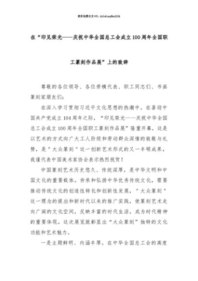 【七哥公文】2025年:【七哥公文】在“印见荣光——庆祝中华全国总工会成立100周年全国职工篆刻作品展”上的致辞+更多免费公文+VX:QiGeGongWen2024+更多免费公文+VX:QiGeGongWen2024