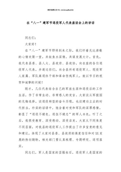 【七哥公文】2025年:【七哥公文】在“八一”建军节退役军人代表座谈会上的讲话+更多免费公文+VX:QiGeGongWen2024+更多免费公文+VX:QiGeGongWen2024
