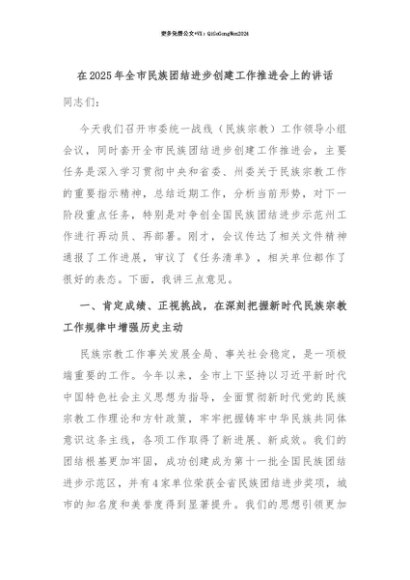 【七哥公文】2025年:【七哥公文】在2025年全市民族团结进步创建工作推进会上的讲话+更多免费公文+VX:QiGeGongWen2024+更多免费公文+VX:QiGeGongWen2024