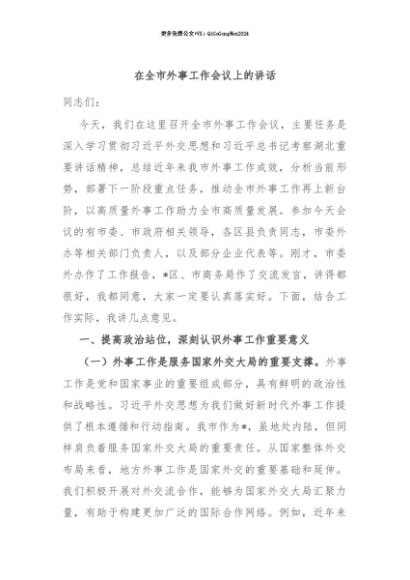 【七哥公文】2025年:【七哥公文】在全市外事工作会议上的讲话+更多免费公文+VX:QiGeGongWen2024+更多免费公文+VX:QiGeGongWen2024