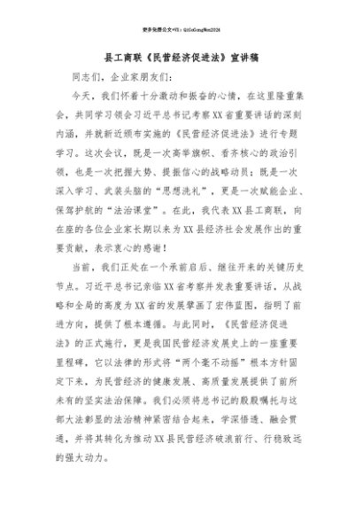 【七哥公文】2025年:【七哥公文】县工商联《民营经济促进法》宣讲稿+更多免费公文+VX:QiGeGongWen2024+更多免费公文+VX:QiGeGongWen2024