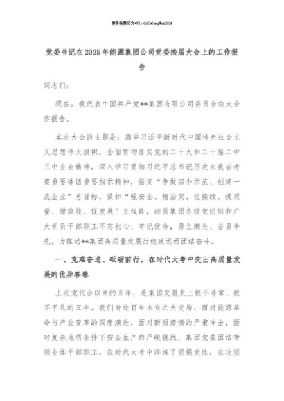 【七哥公文】2025年:【七哥公文】党委书记在2025年能源集团公司党委换届大会上的工作报告+更多免费公文+VX:QiGeGongWen2024+更多免费公文+VX:QiGeGongWen2024