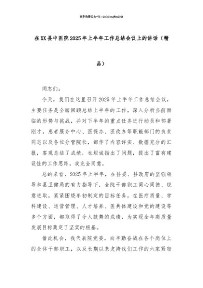 【七哥公文】2025年:【七哥公文】在XX县中医院2025年上半年工作总结会议上的讲话(精品)+更多免费公文+VX:QiGeGongWen2024+更多免费公文+VX:QiGeGongWen2024