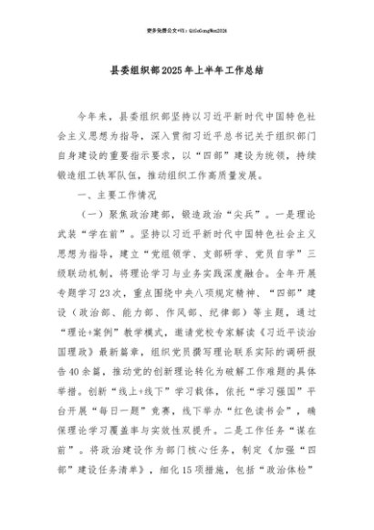 【七哥公文】2025年:【七哥公文】县委组织部2025年上半年工作总结+更多免费公文+VX:QiGeGongWen2024+更多免费公文+VX:QiGeGongWen2024