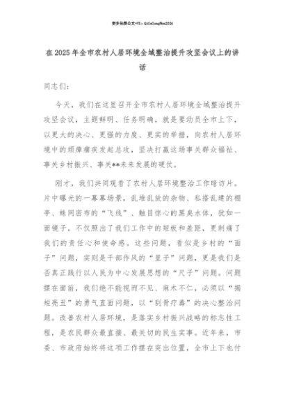 【七哥公文】2025年:【七哥公文】在2025年全市农村人居环境全域整治提升攻坚会议上的讲话+更多免费公文+VX:QiGeGongWen2024+更多免费公文+VX:QiGeGongWen2024