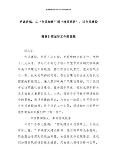 【七哥公文】2025年:【七哥公文】党课讲稿:从“作风如磐”到“清风信访”,以作风建设精神引领信访工作新征程+更多免费公文+VX:QiGeGongWen2024+更多免费公文+VX:QiGeGongWen2024