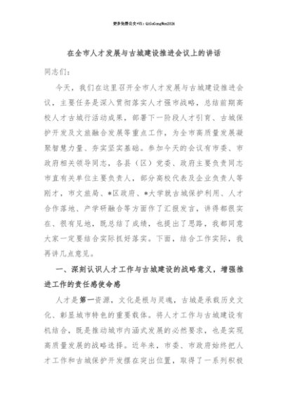 【七哥公文】2025年:【七哥公文】在全市人才发展与古城建设推进会议上的讲话+更多免费公文+VX:QiGeGongWen2024+更多免费公文+VX:QiGeGongWen2024
