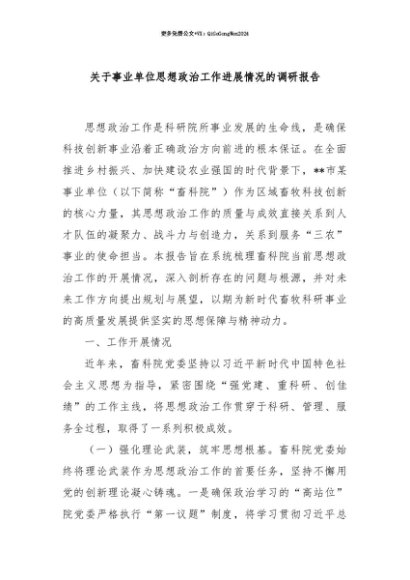 【七哥公文】2025年:【七哥公文】关于事业单位思想政治工作进展情况的调研报告+更多免费公文+VX:QiGeGongWen2024+更多免费公文+VX:QiGeGongWen2024