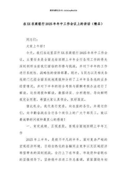 【七哥公文】2025年:【七哥公文】在XX农商银行2025年年中工作会议上的讲话(精品)+更多免费公文+VX:QiGeGongWen2024+更多免费公文+VX:QiGeGongWen2024