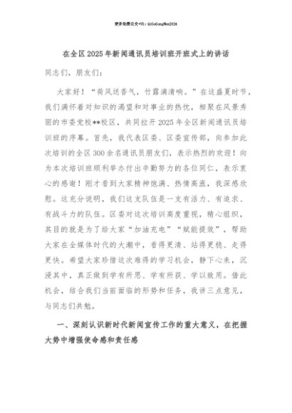 【七哥公文】2025年:【七哥公文】在全区2025年新闻通讯员培训班开班式上的讲话+更多免费公文+VX:QiGeGongWen2024+更多免费公文+VX:QiGeGongWen2024