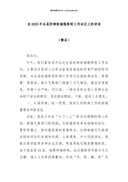 【七哥公文】2025年:【七哥公文】在2025年全县防御极端强降雨工作会议上的讲话(精品)+更多免费公文+VX:QiGeGongWen2024+更多免费公文+VX:QiGeGongWen2024