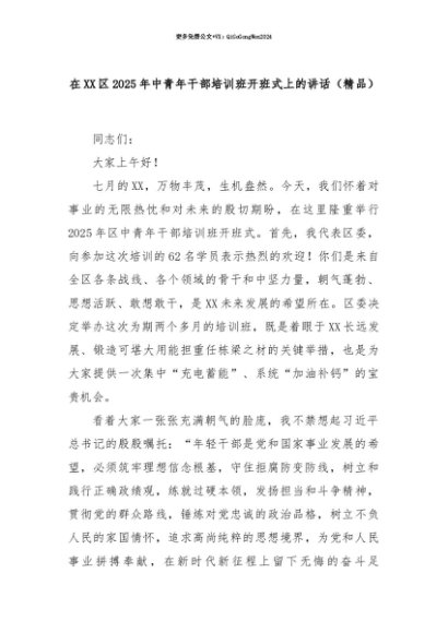 【七哥公文】2025年:【七哥公文】在XX区2025年中青年干部培训班开班式上的讲话(精品)+更多免费公文+VX:QiGeGongWen2024+更多免费公文+VX:QiGeGongWen2024