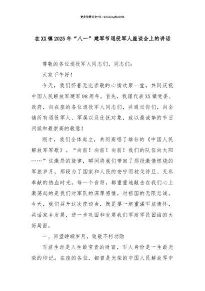 【七哥公文】2025年:【七哥公文】在XX镇2025年“八一”建军节退役军人座谈会上的讲话+更多免费公文+VX:QiGeGongWen2024+更多免费公文+VX:QiGeGongWen2024