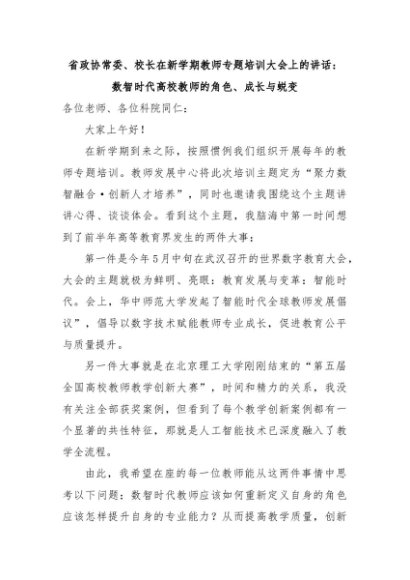 【七哥公文】2025年:省政协常委、校长在新学期教师专题培训大会上的讲话:数智时代高校教师的角色、成长与蜕变+更多免费公文+VX:QiGeGongWen2024