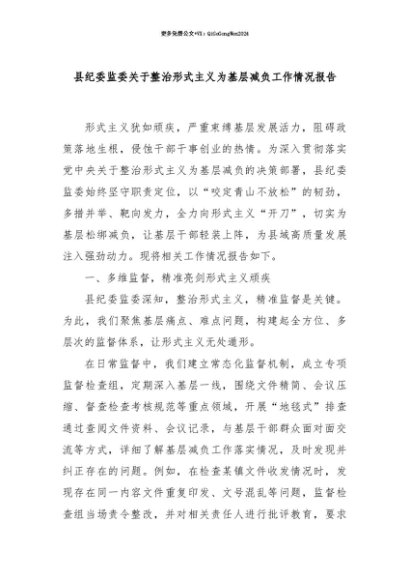【七哥公文】2025年:【七哥公文】县纪委监委关于整治形式主义为基层减负工作情况报告+更多免费公文+VX:QiGeGongWen2024+更多免费公文+VX:QiGeGongWen2024