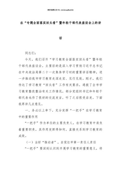 【七哥公文】2025年:【七哥公文】在“专题全面落实回头看”暨年轻干部代表座谈会上的讲话+更多免费公文+VX:QiGeGongWen2024+更多免费公文+VX:QiGeGongWen2024