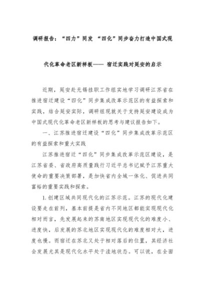 【七哥公文】2025年:调研报告:“四力”同发 “四化”同步奋力打造中国式现代化革命老区新样板—— 宿迁实践对延安的启示+更多免费公文+VX:QiGeGongWen2024
