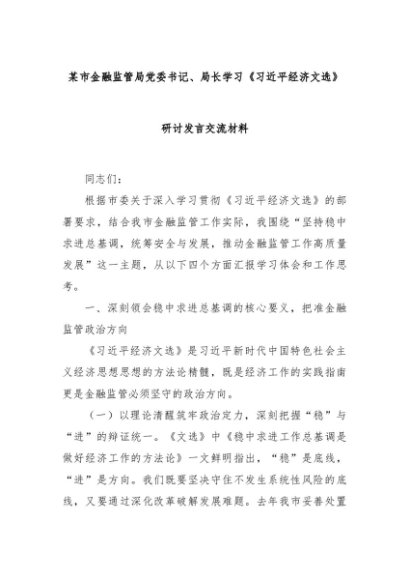 【七哥公文】2025年:某市金融监管局党委书记、局长学习《总书记经济文选》研讨发言交流材料+更多免费公文+VX:QiGeGongWen2024