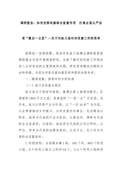 【七哥公文】2025年:调研报告:如何发挥巡察综合监督作用 打通全面从严治党“最后一公里”--关于对洛川县对村巡察工作的思考+更多免费公文+VX:QiGeGongWen2024