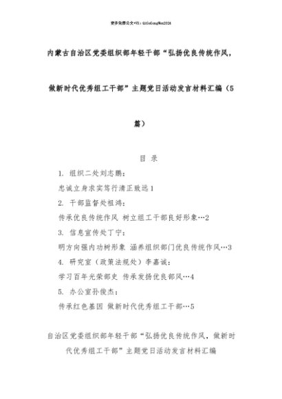 【七哥公文】2025年:【七哥公文】(5篇)内蒙古自治区党委组织部年轻干部“弘扬优良传统作风,做新时代优秀组工干部”主题党日活动发言材料汇编+更多免费公文+VX:QiGeGongWen2024+更多免费公文+VX:QiGeGongWen2024