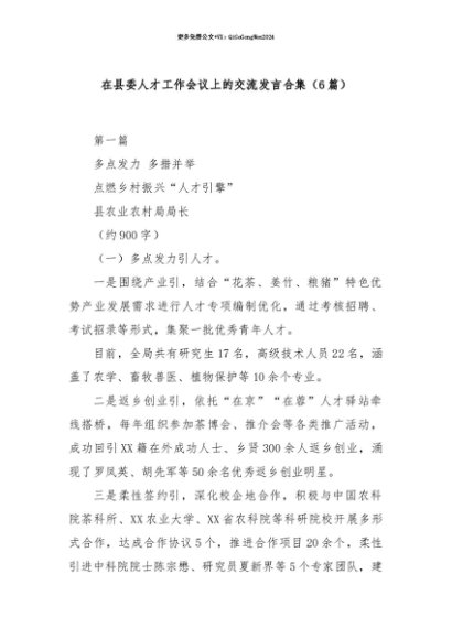 【七哥公文】2025年:【七哥公文】(6篇)在县委人才工作会议上的交流发言合集+更多免费公文+VX:QiGeGongWen2024+更多免费公文+VX:QiGeGongWen2024