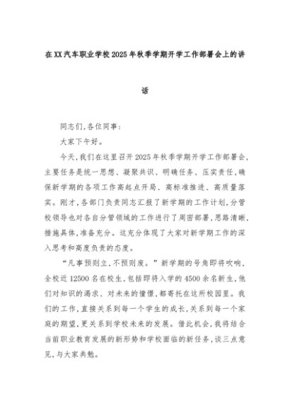 【七哥公文】2025年:在XX汽车职业学校2025年秋季学期开学工作部署会上的讲话+更多免费公文+VX:QiGeGongWen2024