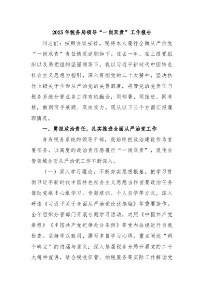 / 【七哥公文】2025年:2025年税务局领导“一岗双责”工作报告+更多免费公文+VX:QiGeGongWen2024