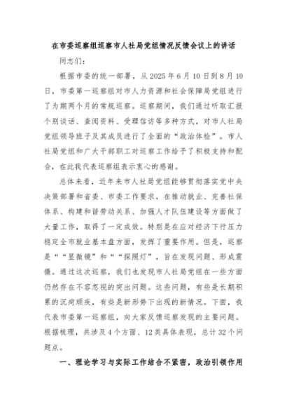 / 【七哥公文】2025年:在市委巡察组巡察市人社局党组情况反馈会议上的讲话+更多免费公文+VX:QiGeGongWen2024