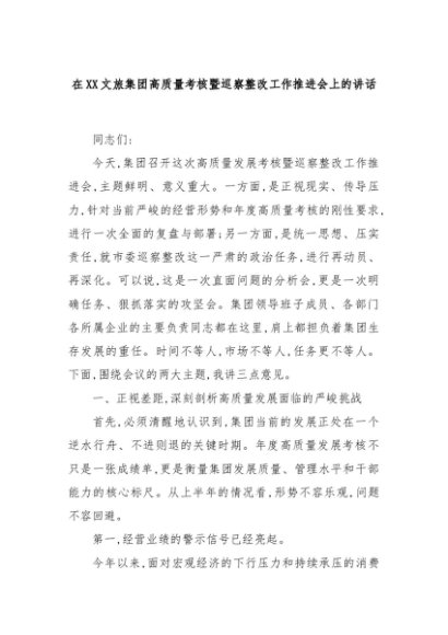【七哥公文】2025年:在XX文旅集团高质量考核暨巡察整改工作推进会上的讲话+更多免费公文+VX:QiGeGongWen2024