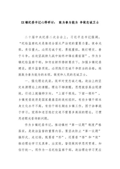 【七哥公文】2025年:XX镇纪委书记心得研讨: 敢为善为能为 争做忠诚卫士+更多免费公文+VX:QiGeGongWen2024