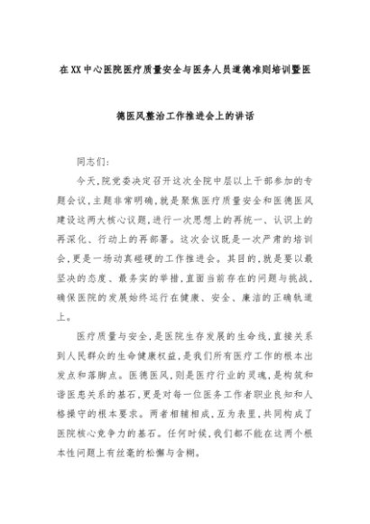 【七哥公文】2025年:在XX中心医院医疗质量安全与医务人员道德准则培训暨医德医风整治工作推进会上的讲话+更多免费公文+VX:QiGeGongWen2024