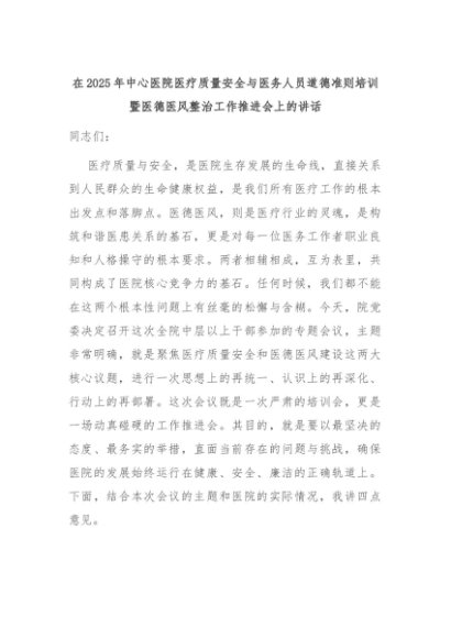 【七哥公文】2025年:在2025年中心医院医疗质量安全与医务人员道德准则培训暨医德医风整治工作推进会上的讲话+更多免费公文+VX:QiGeGongWen2024