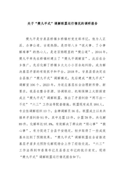 / 【七哥公文】2025年:关于“樊九平式”调解联盟运行情况的调研报告+更多免费公文+VX:QiGeGongWen2024