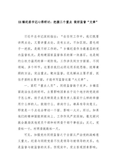 【七哥公文】2025年:XX镇纪委书记心得研讨:把握三个重点 做好监督“文章”+更多免费公文+VX:QiGeGongWen2024